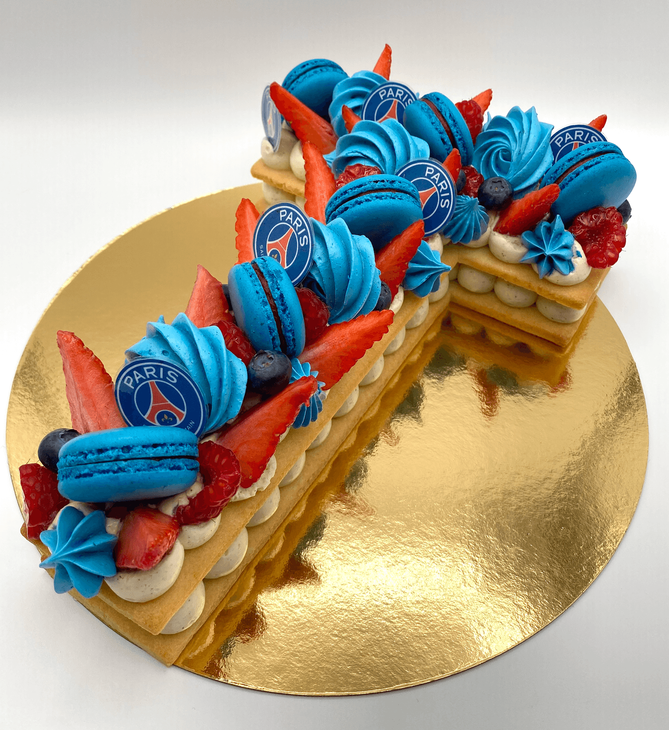 Tous mes numbers cakes sont décorés de macarons et de meringues + d’autres éléments selon les parfums (fruits, noisettes, Kinder, etc.)